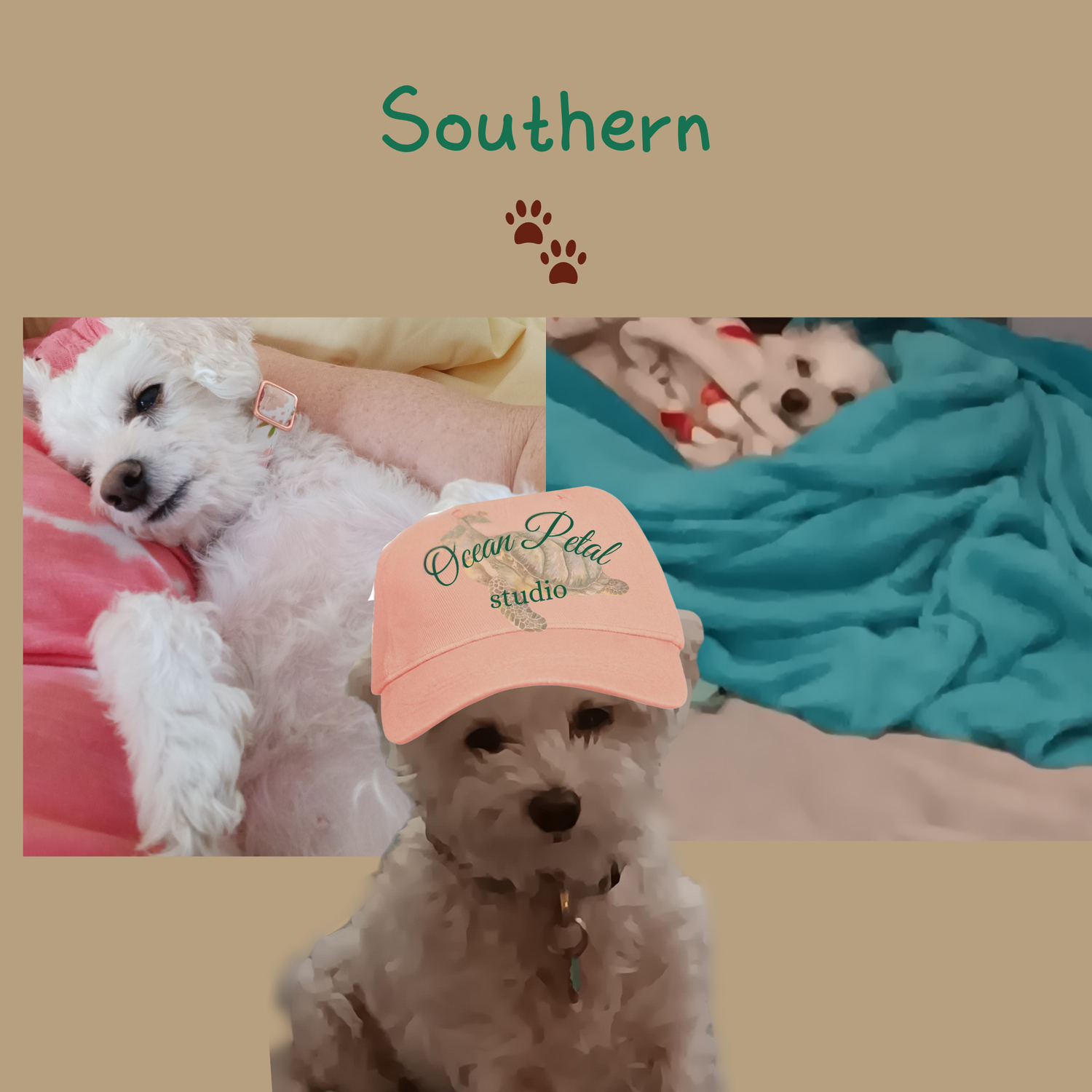 In addition to my mom being at the heart of it all is Southern, my dog, office assistant, and occasional mischief-maker. She’s the reason socks go missing and smiles return. Every item marked Southern Approved has passed her rigorous standards for coziness, charm, and nap-worthiness.