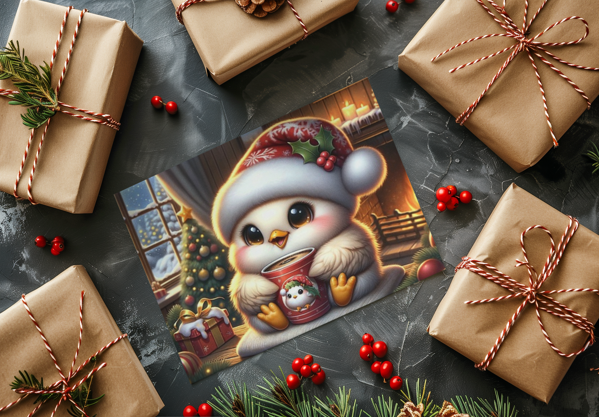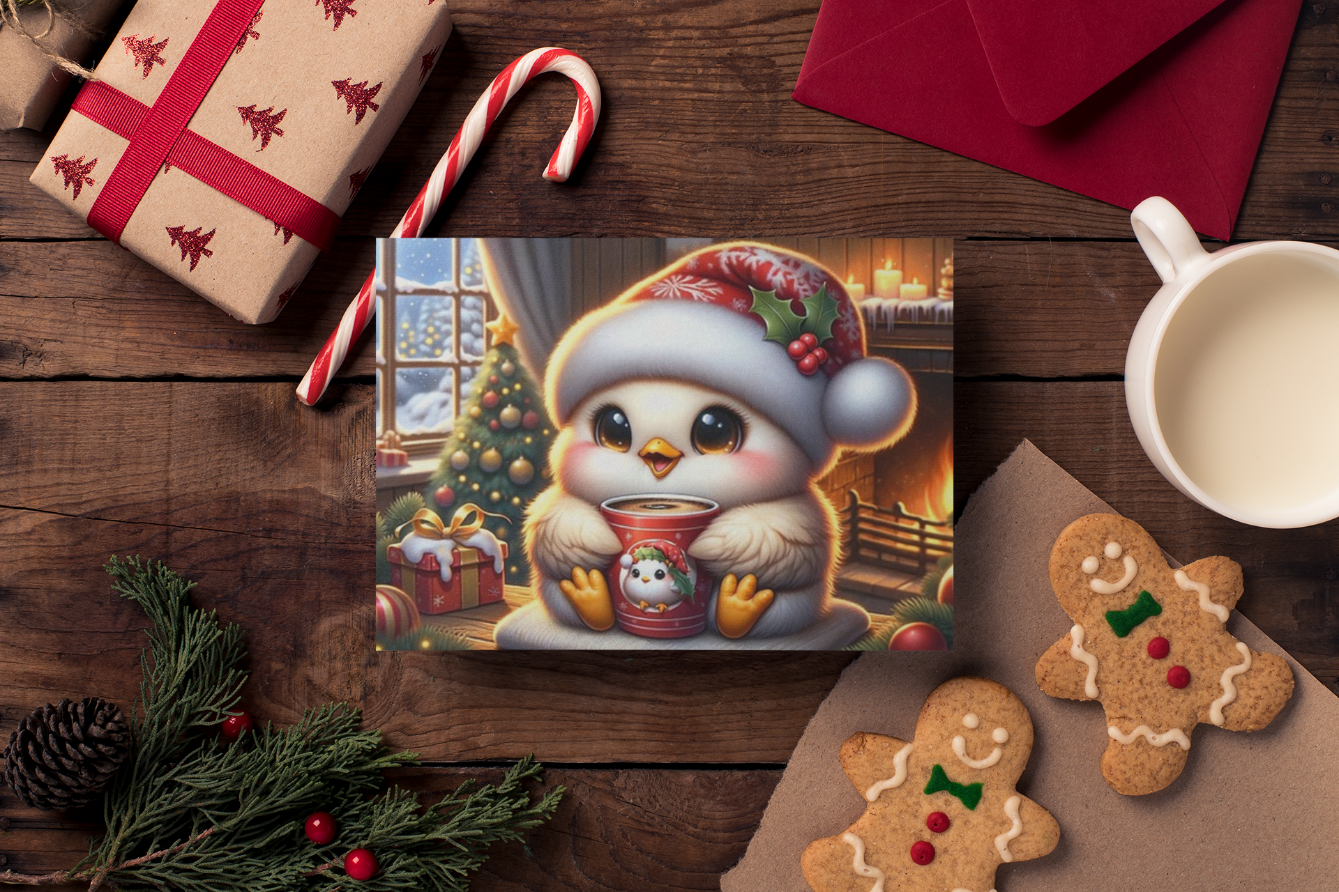 Celebrate the season with a card that honors the quiet, cozy moments we hold dear. Featuring an adorable penguin in a festive room—complete with twinkling tree, glowing fireplace, and a warm mug in hand—this holiday greeting card wraps your message in comfort and charm.