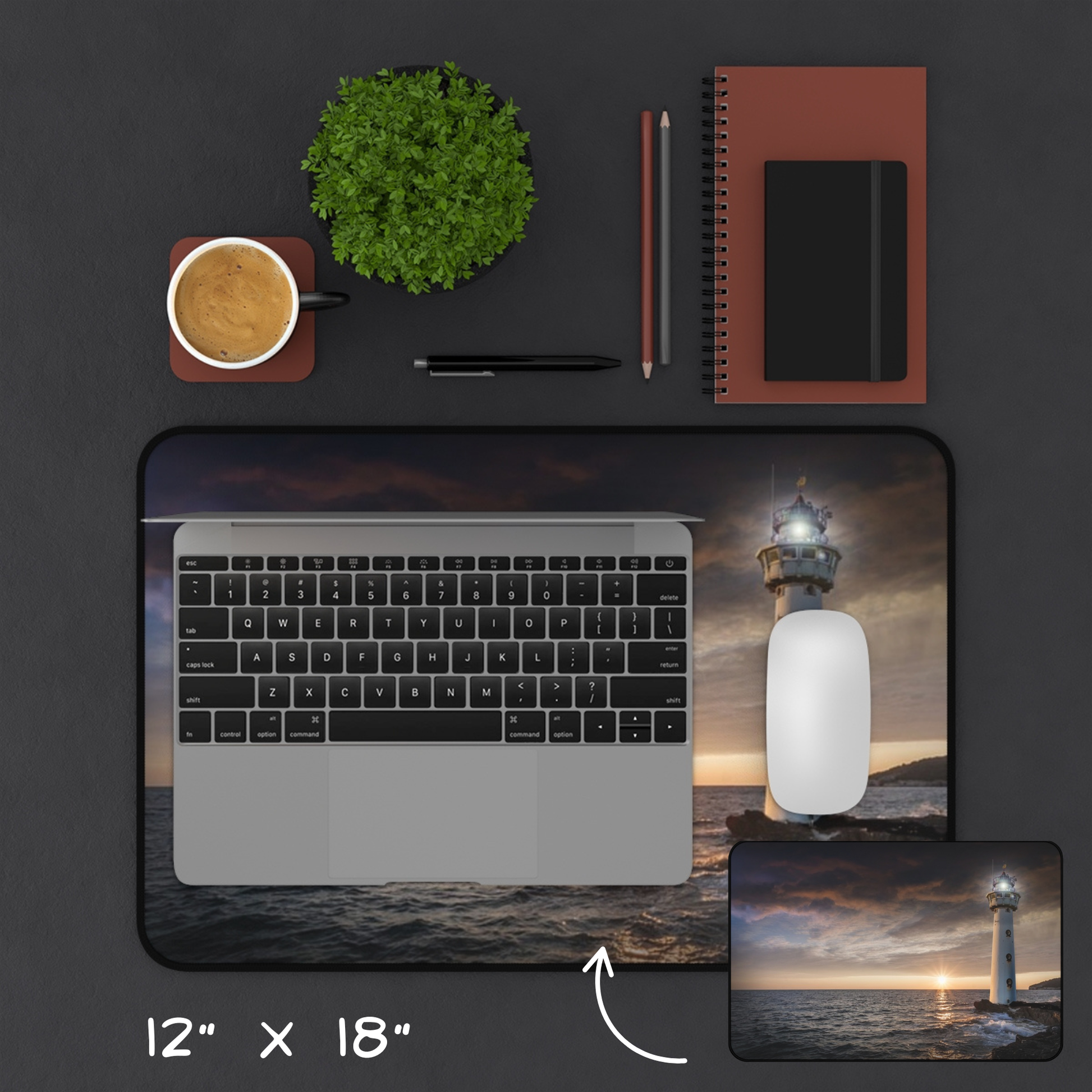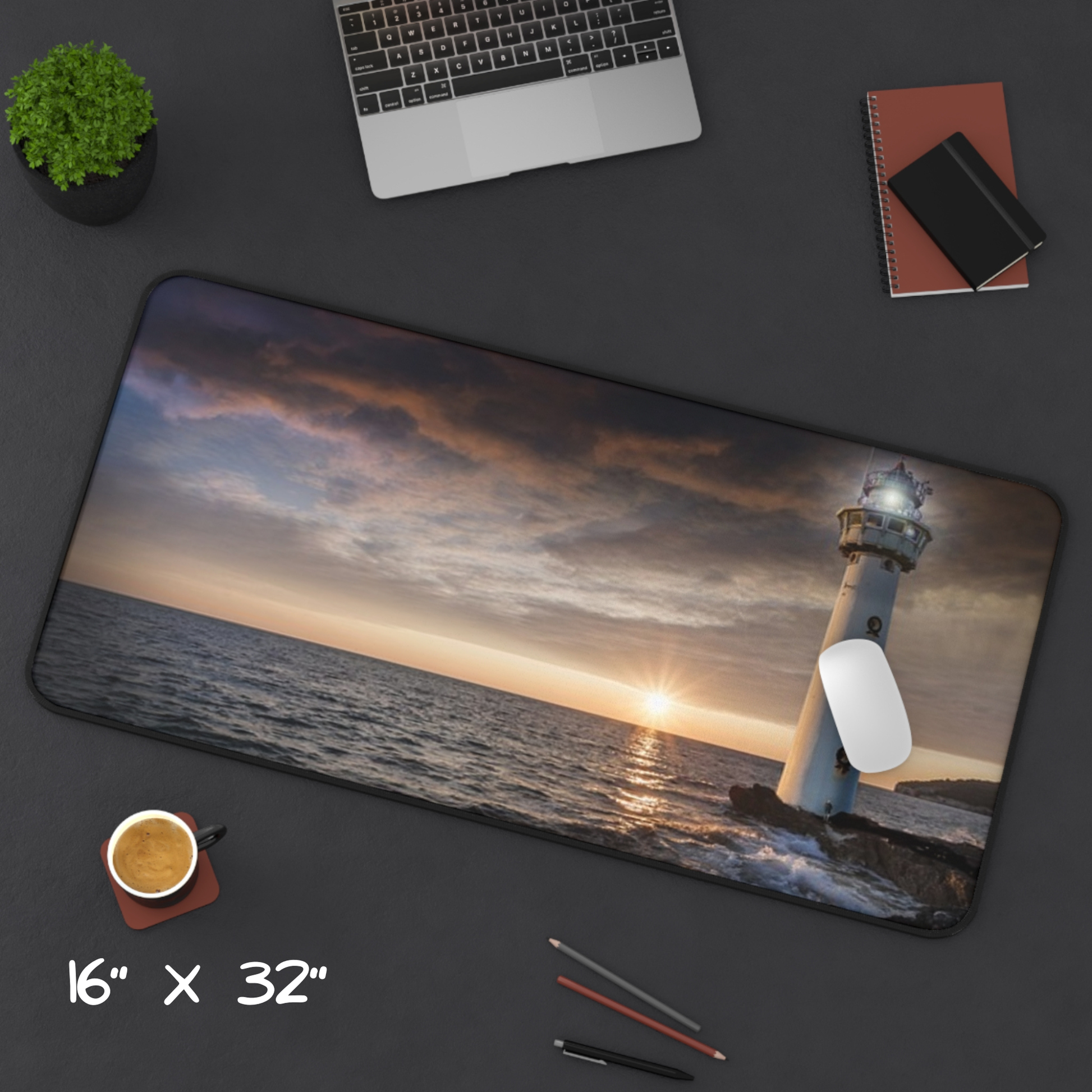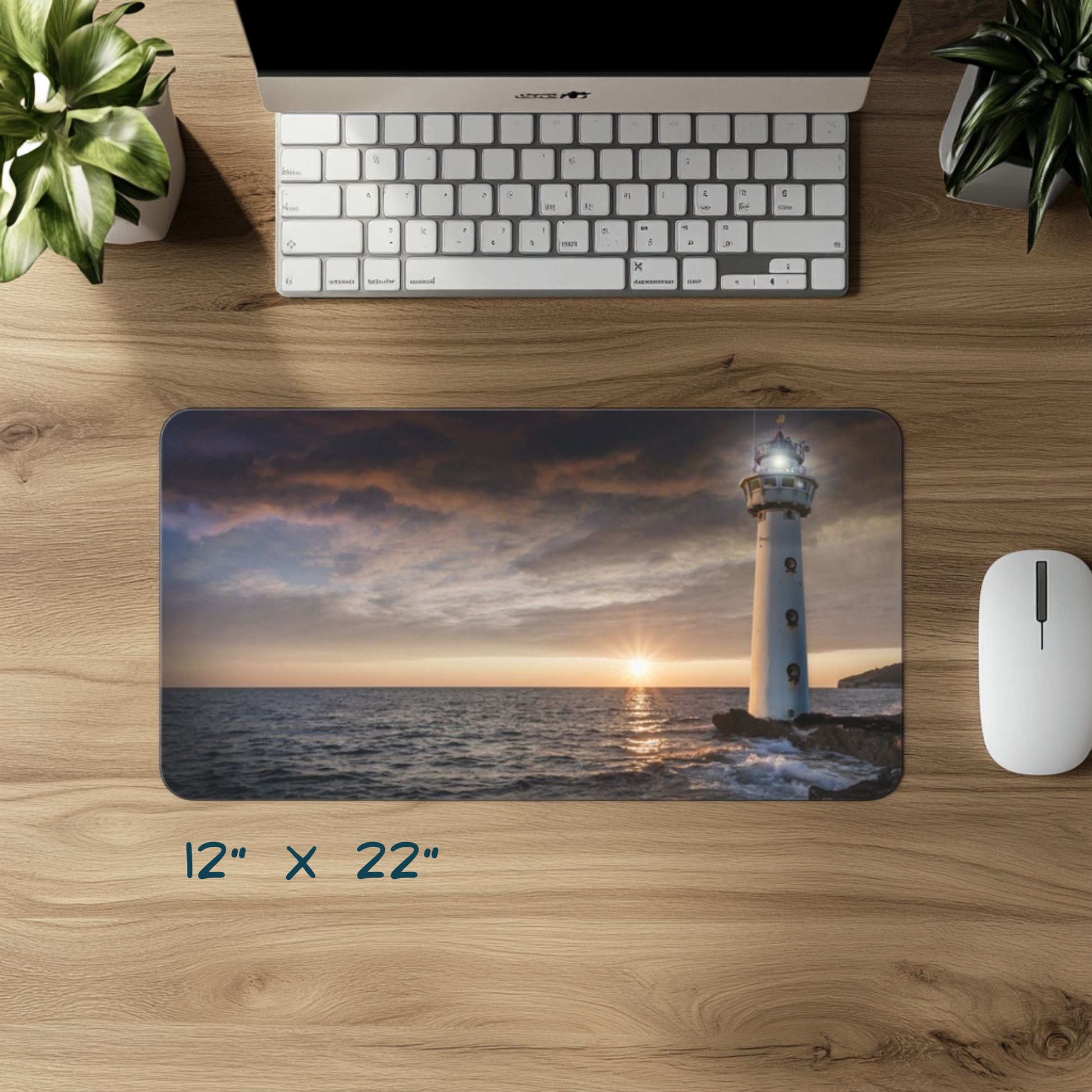 Let your workspace glow with quiet guidance. This desk pad features a tall lighthouse on a rocky coastline, bathed in the warm hues of sunset—orange, purple, and blue blending across sky and sea. It’s a moment of reflection and resilience, designed to bring light and calm to your day.