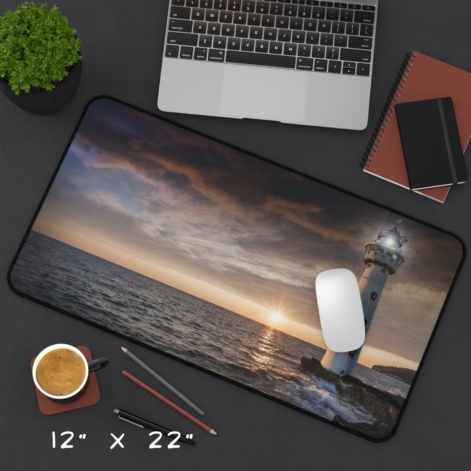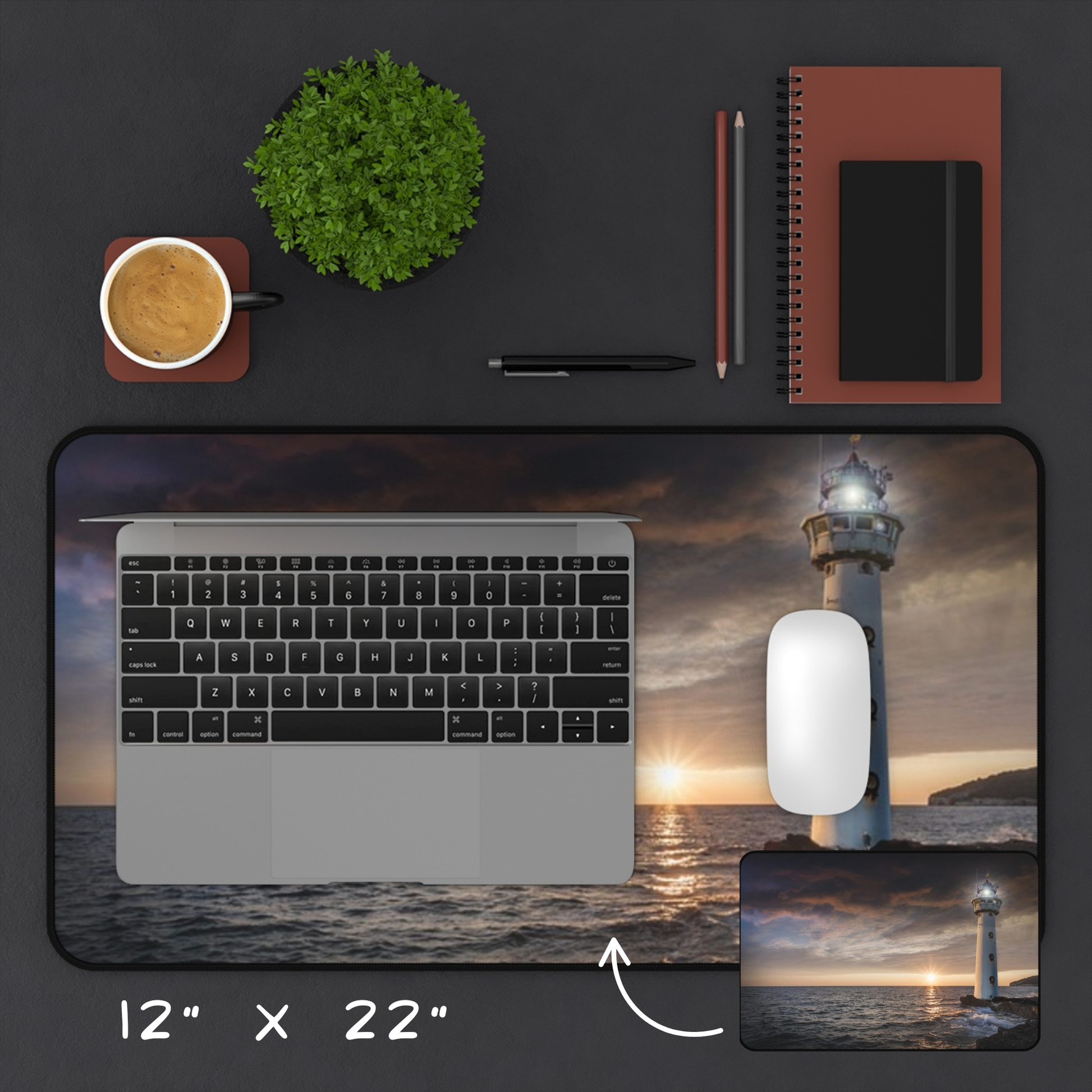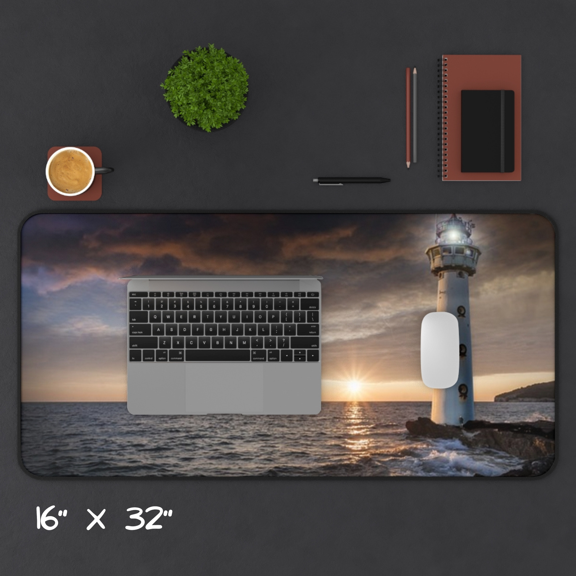 Let your workspace glow with quiet guidance. This desk pad features a tall lighthouse on a rocky coastline, bathed in the warm hues of sunset—orange, purple, and blue blending across sky and sea. It’s a moment of reflection and resilience, designed to bring light and calm to your day.