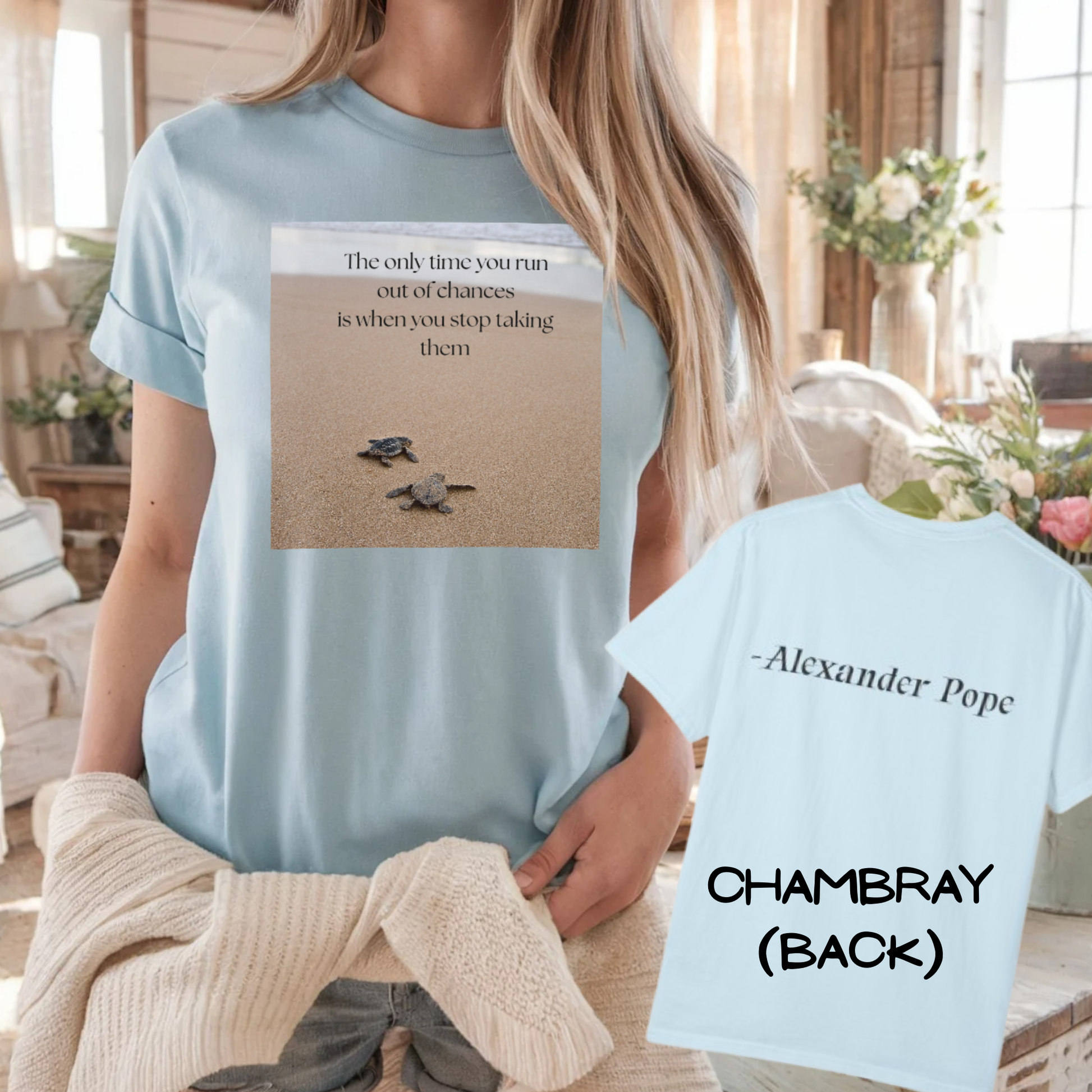 This unisex tee is more than just a shirt—it’s a wearable reminder to keep going. Featuring a serene beach scene with two turtles and the quote “The only time you run out of chances is when you stop taking them,” it’s designed to offer comfort and quiet motivation wherever life takes you.